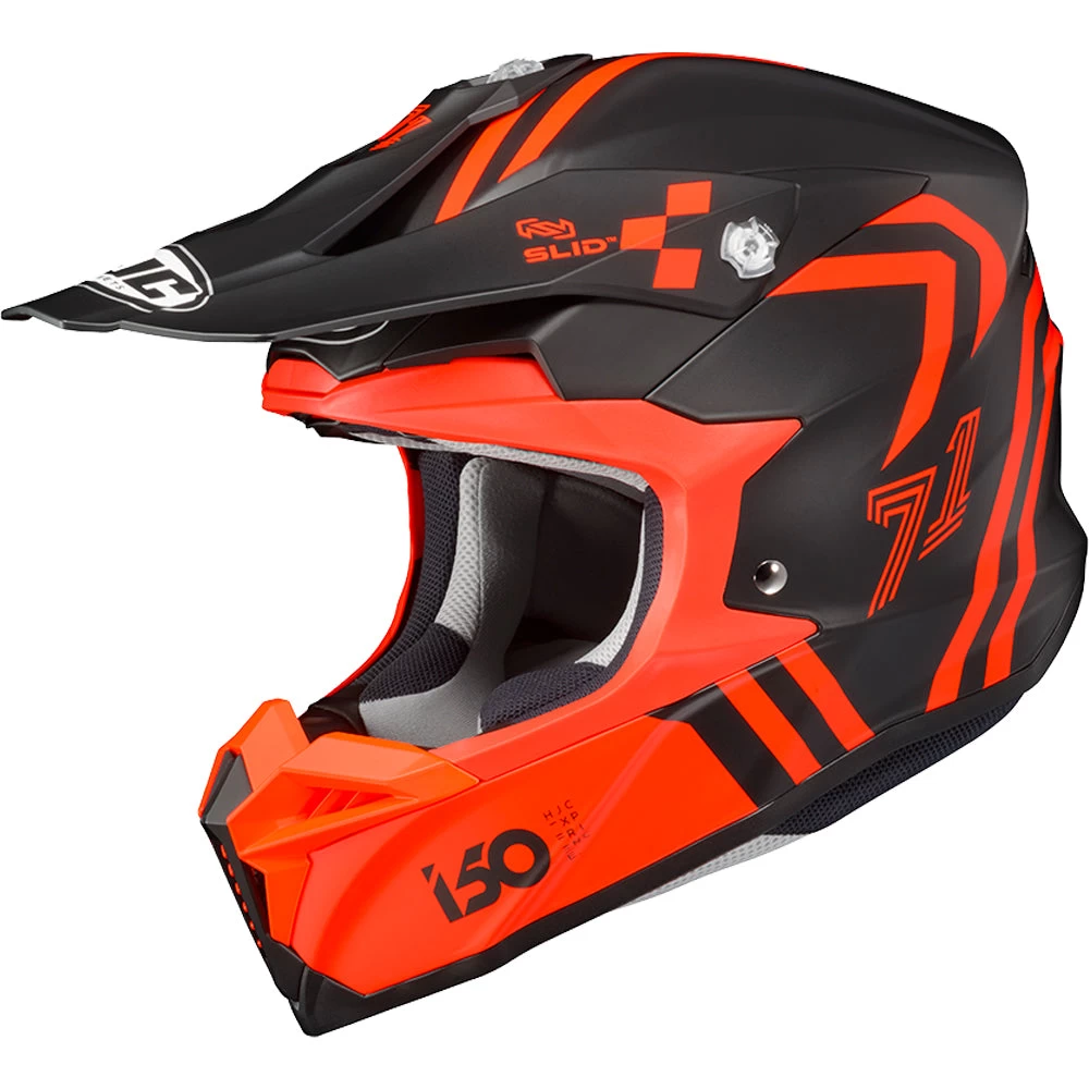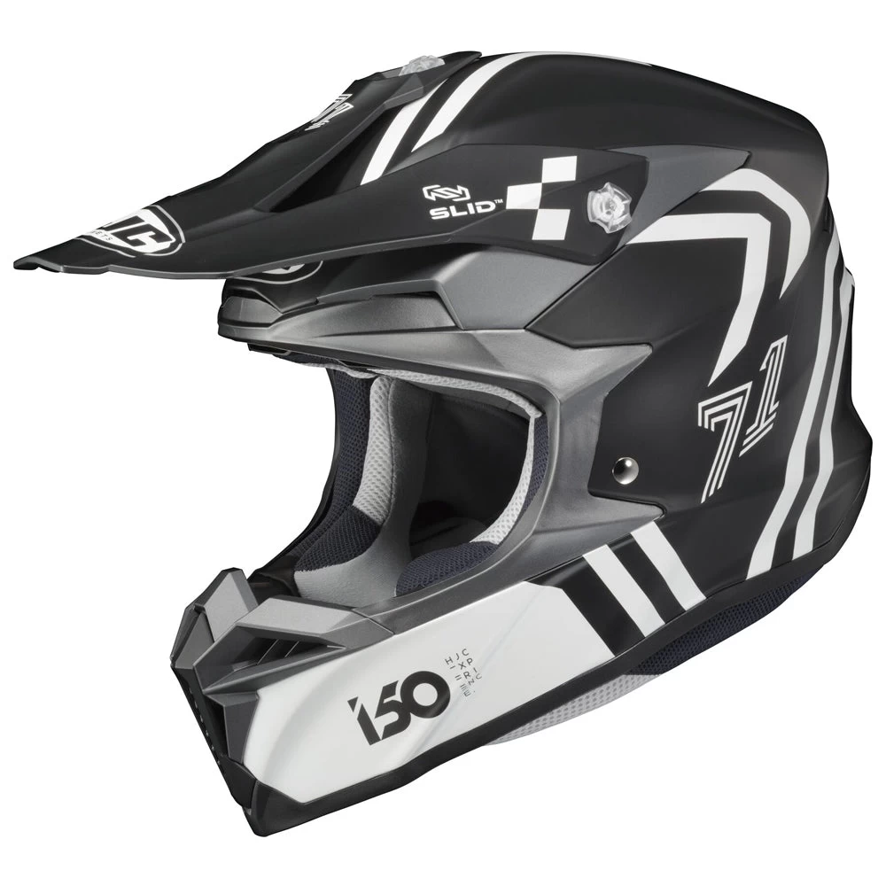HJC’s new off-road helmet is designed to create ease and comfort for the rider in an aggressive and attractive design. A large, repositioned eye-port optimizes the view for downward visibility. Dual-position goggle band fitment adjusts for the rider’s comfort and preference. The extended visor blocks sunlight and protects the rider from debris and is flexible to allow the material to bend instead of break. The tool-less, changeable mouth vent allows for easy cleaning. “ACS” Advanced Channeling Ventilation system allows full front to back airflow to flush heat and humidity up and out, while the SuperCool® Interior keeps the rider cool and fresh with moisture-wicking and antibacterial fabric that is removable and washable. The I 50 features SLID (Sliding Layer Impact Distribution), HJC’s impact distribution technology.